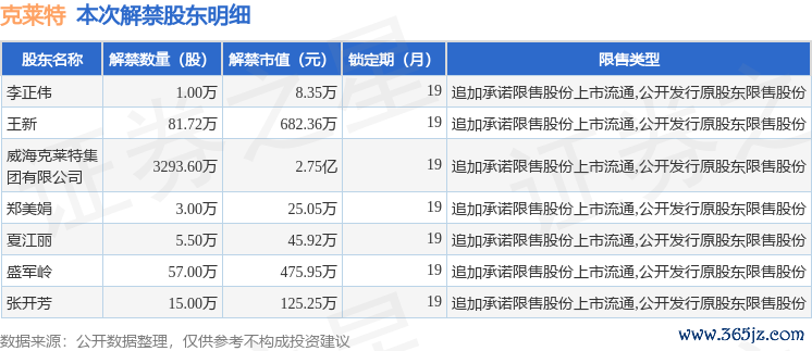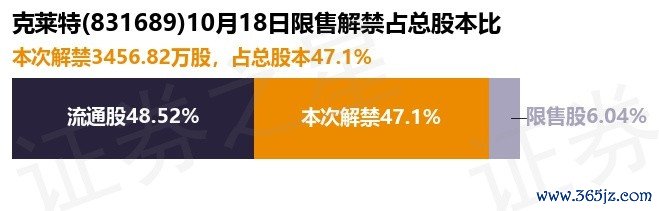 证券之星消息,根据市场公开信息整理,克莱特(831689)于10月18日将有3456.82万股限售股份解禁上市,为公司追加承诺限售股份上市流通,公开发行原股东限售股份,占公司总股本47.1%。最近一年内,该股累计解禁769.0万股,占总股本的10.48%。本次解禁后,公司还有443.17万股限售股份,占总股本6.04%。具体如下图所示: